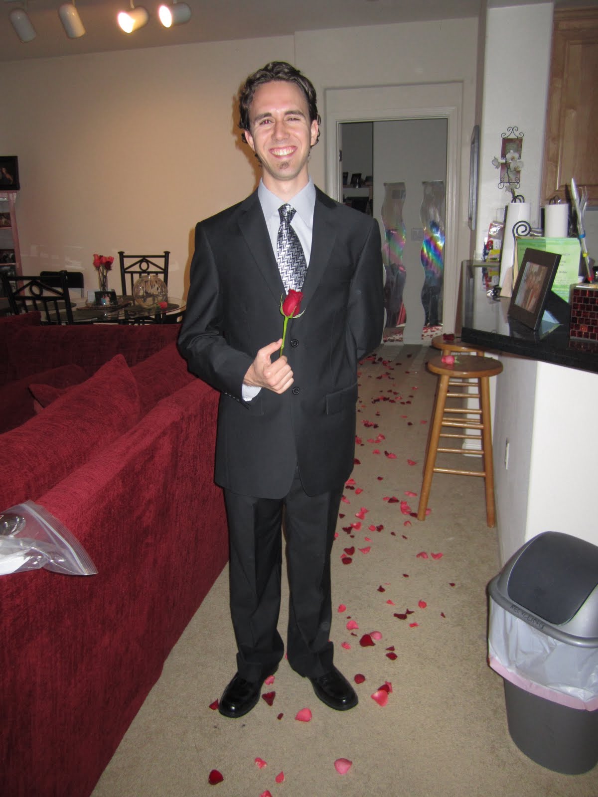 Ryan was hiding and then came out holding a rose all dressed up in his black suit.